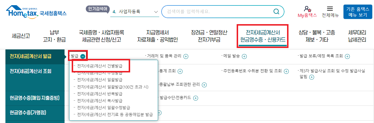 3. 전자(세금) 계산서 건별 발급 클릭