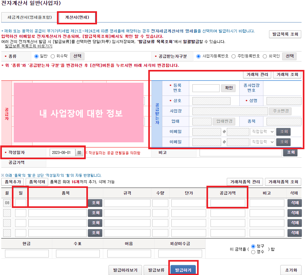 - 이메일주소 : 상대방이 계산서를 받을 메일주소