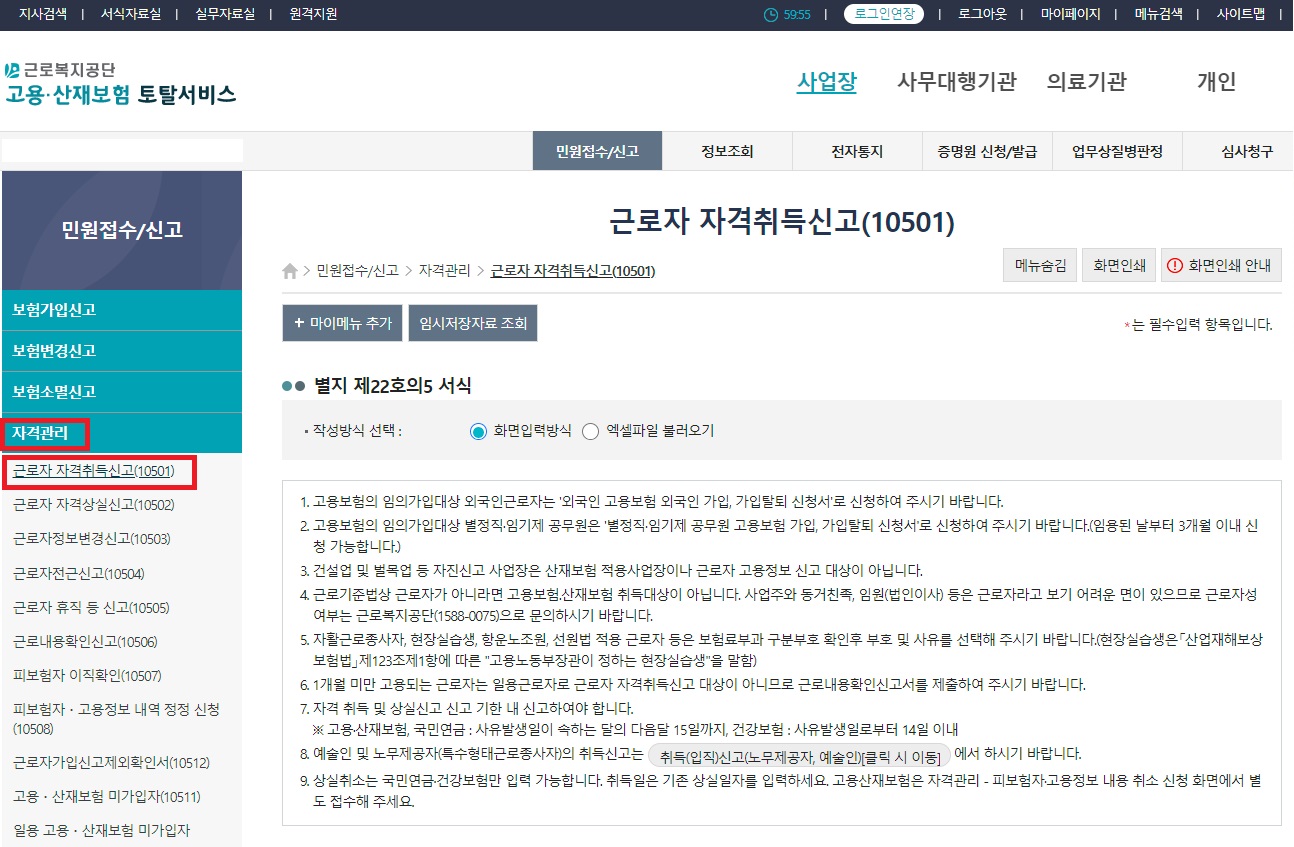2. [민원접수/신고] -> 자격관리 -> 근로자 자격취득신고